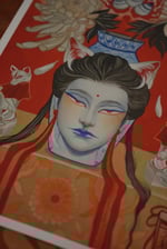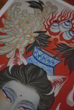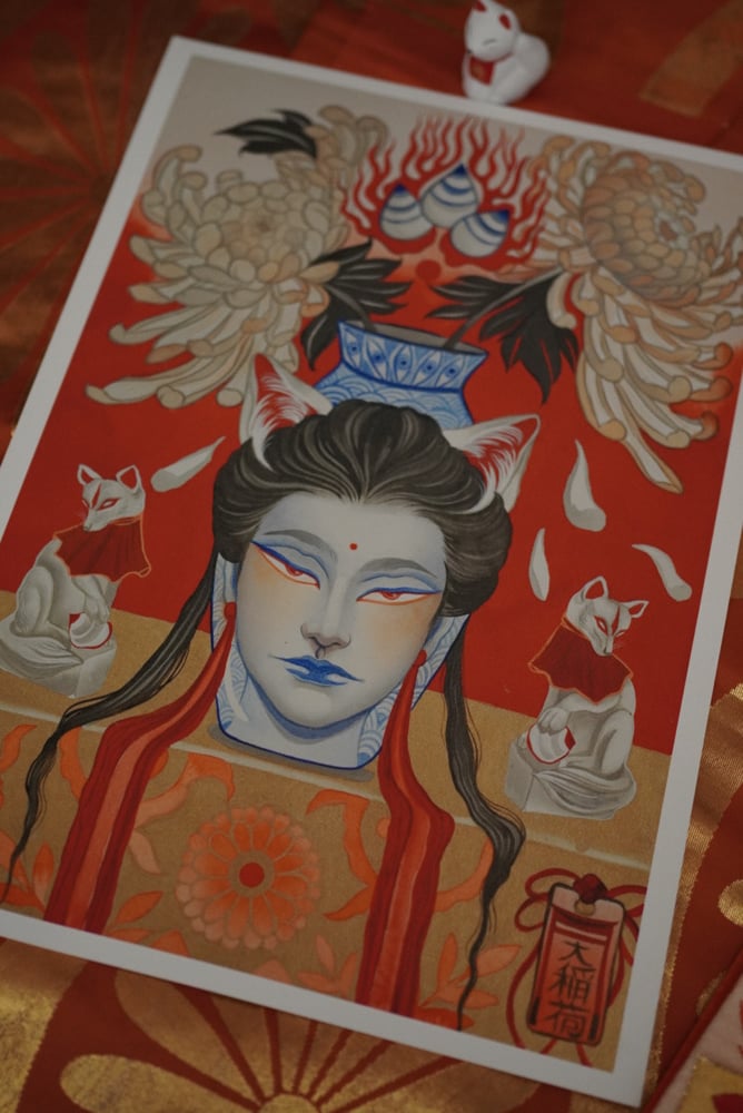 Inspired on Lorena’s travel through Japan. This print portraits inspirations by all Inari temples she visited . The original was painted with materials she purchased in Japan , brushes and Japanese ink .